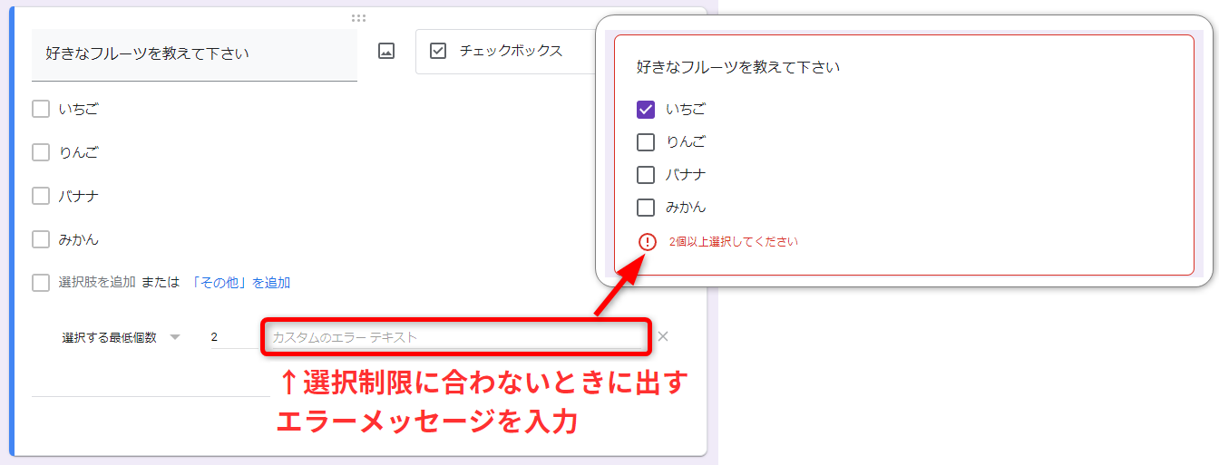 回答時、選択数に合わない数を回答した場合にエラーメッセージを出すことができます。