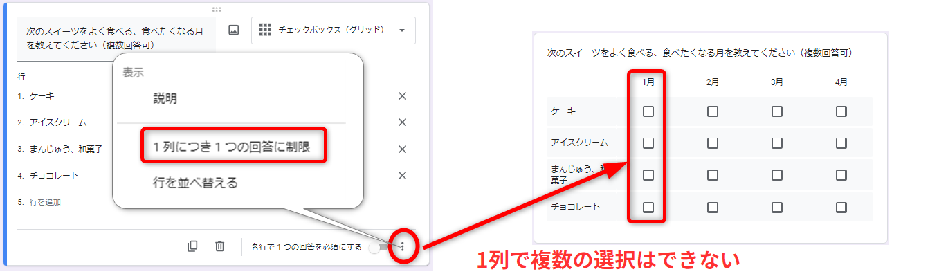 チェックボックス(グリッド)の場合は、[1列につき1つの回答に制限]が指定できます。