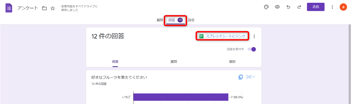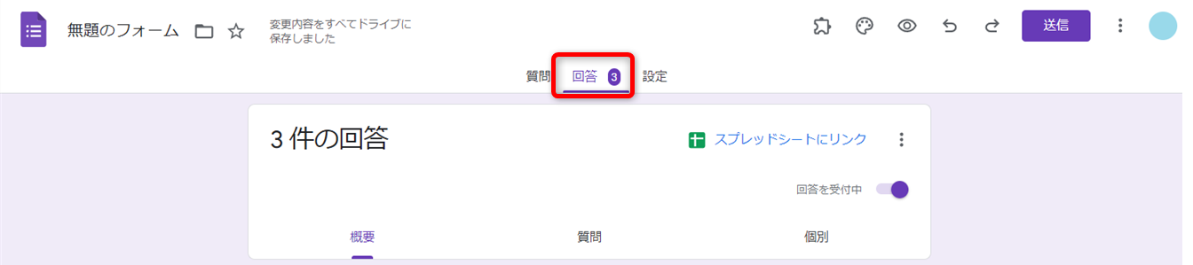 Googleフォームの集計を見るには、[回答]タブをクリックします。