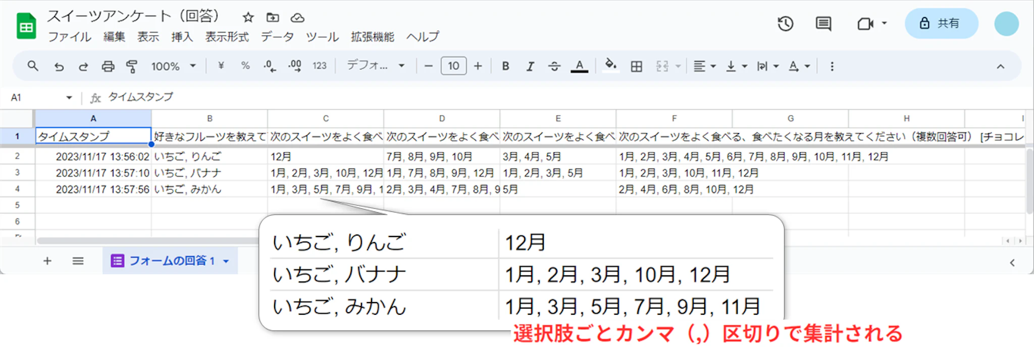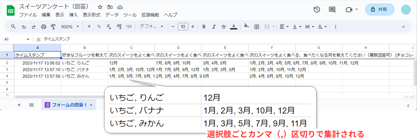 GoogleスプレッドシートにGoogleフォームを連携すると、1問1列で集計し、選択肢ごとに「,(カンマ)」で区切って集計されます。