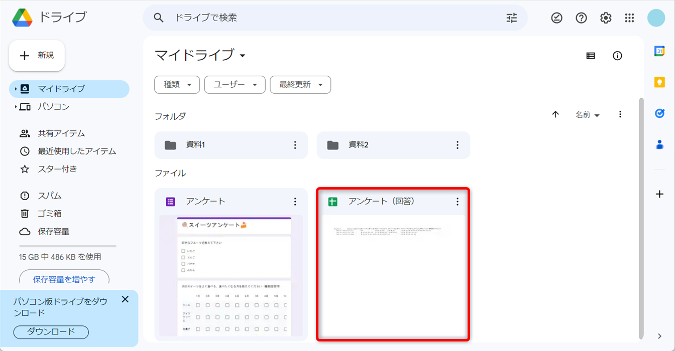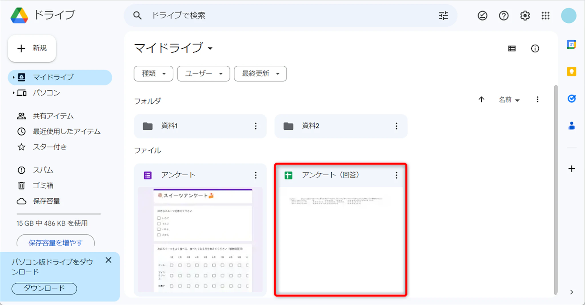 新規作成で保存場所を指定しなければ、Googleフォームと同じ場所に保存されます。