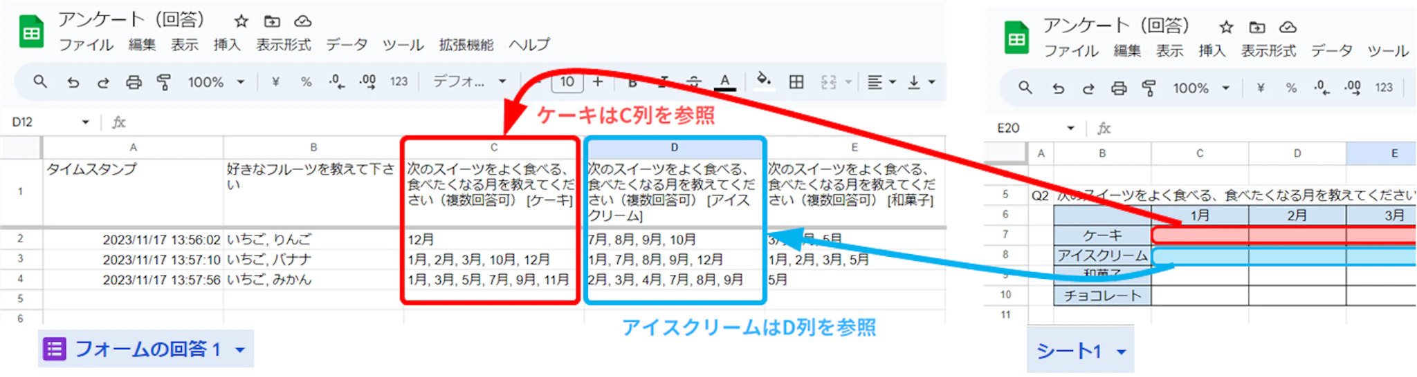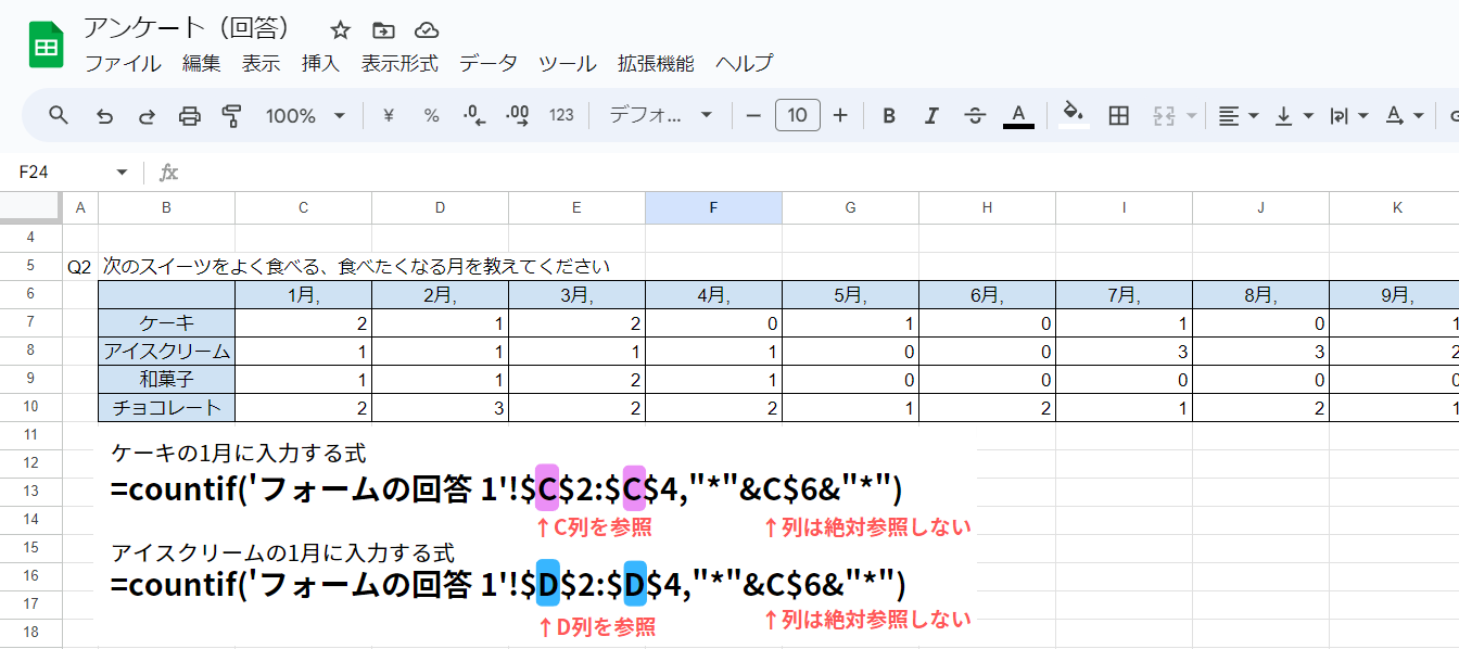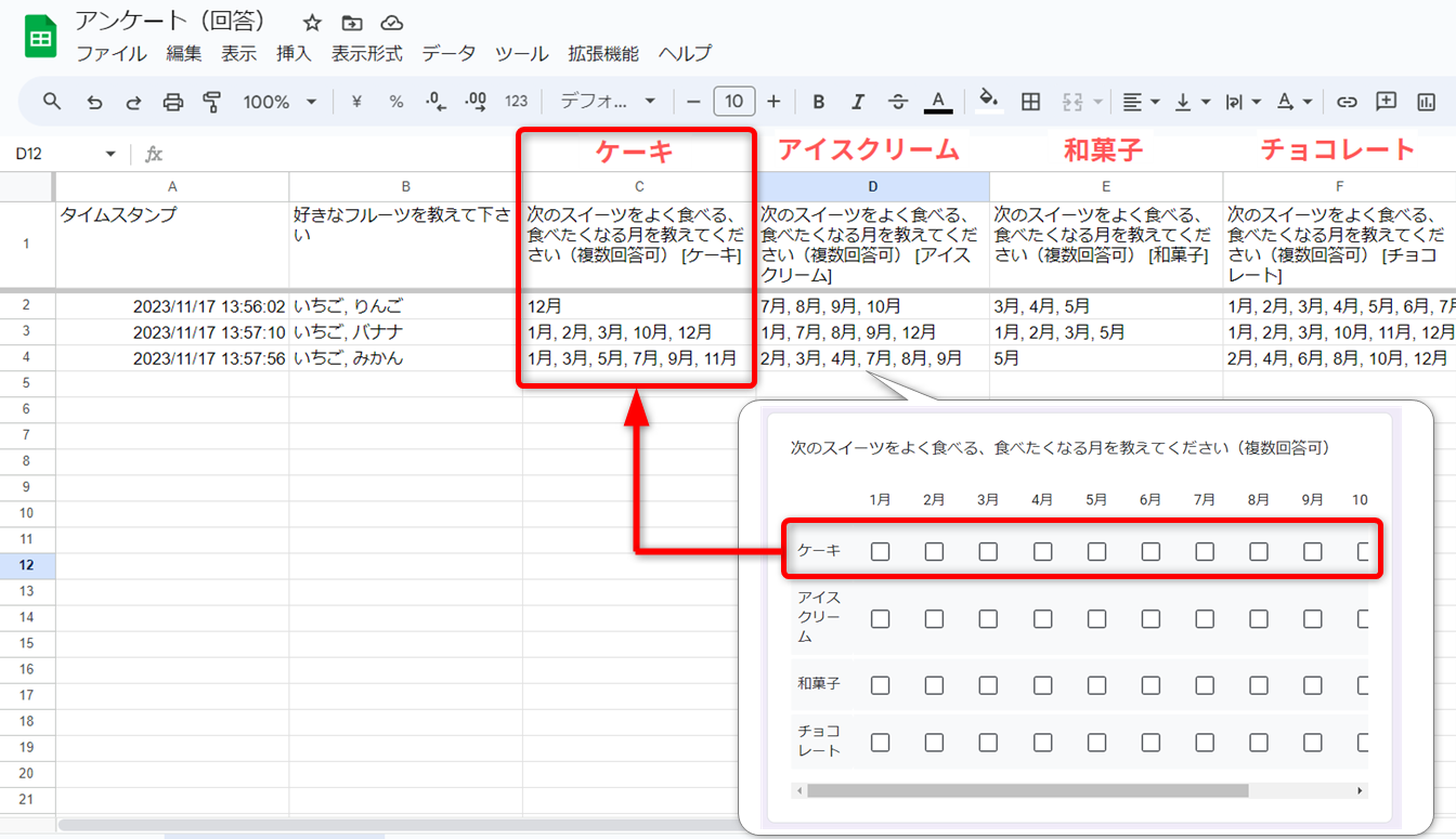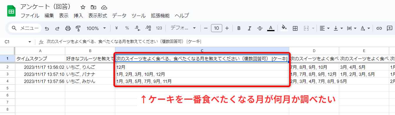 「ケーキ」の項目で、一番回答が多かった月や、月ごとの回答数が知りたい場合はこのままでは集計できません。