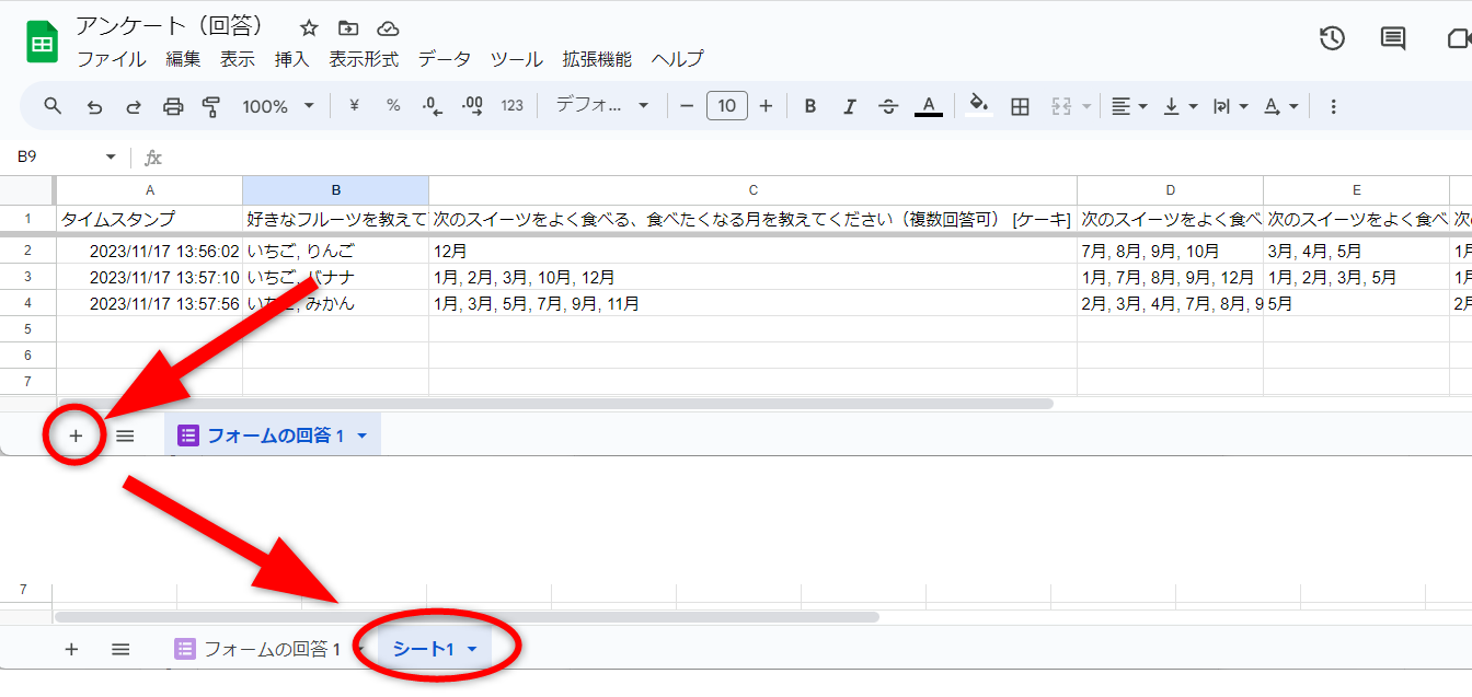 「フォームの回答1」とは別に、集計用のシートを作成しましょう。