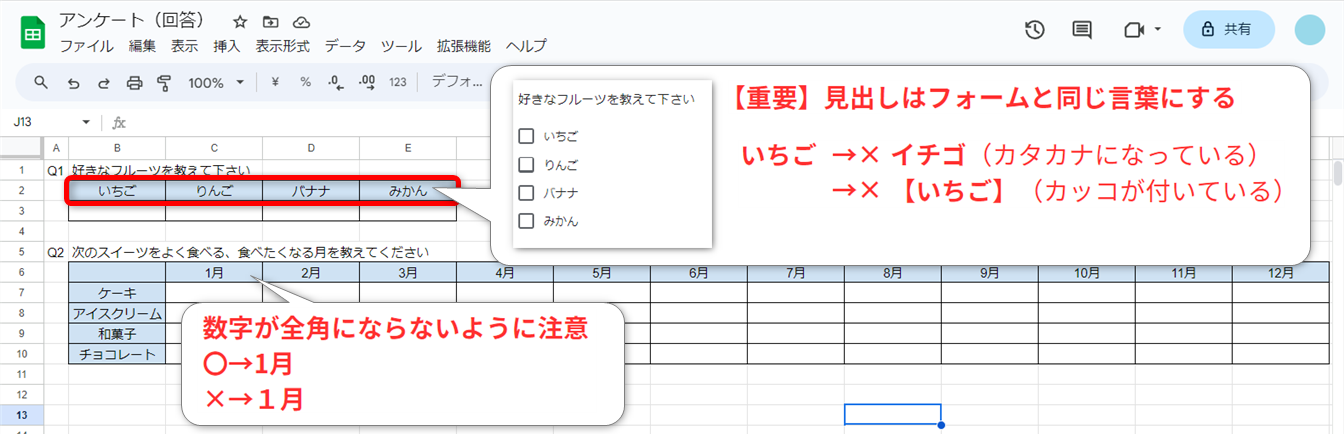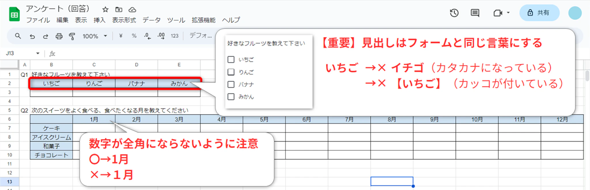 この時、見出し(青色のセル)は、Googleフォームの選択肢や項目と同じワードにするように気を付けましょう。