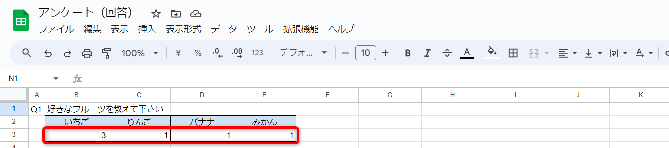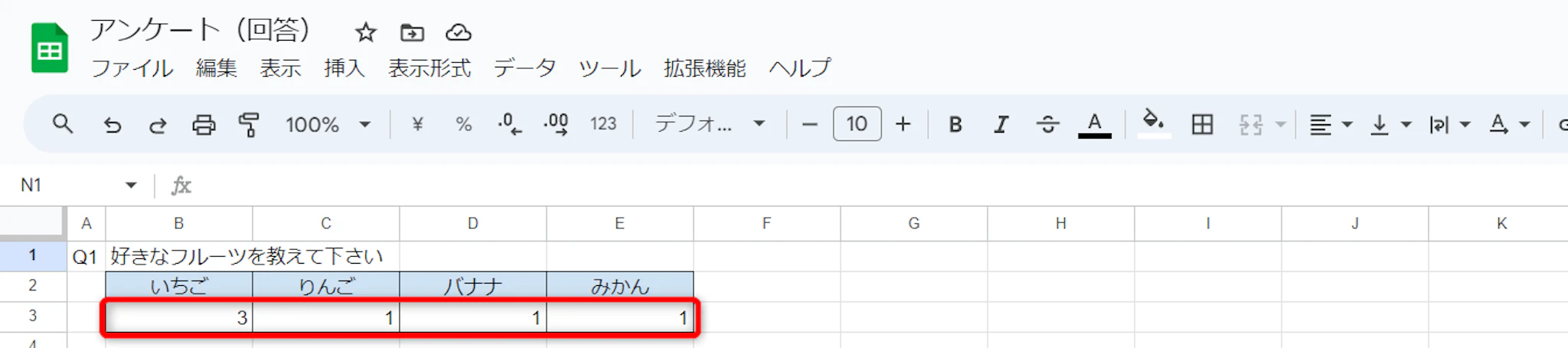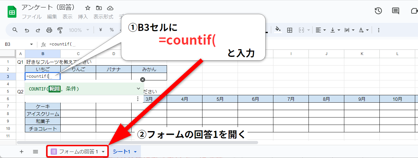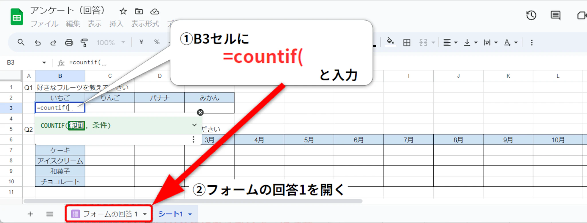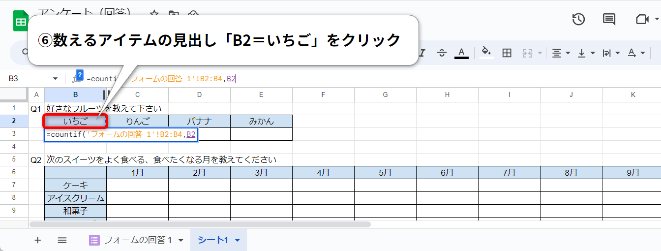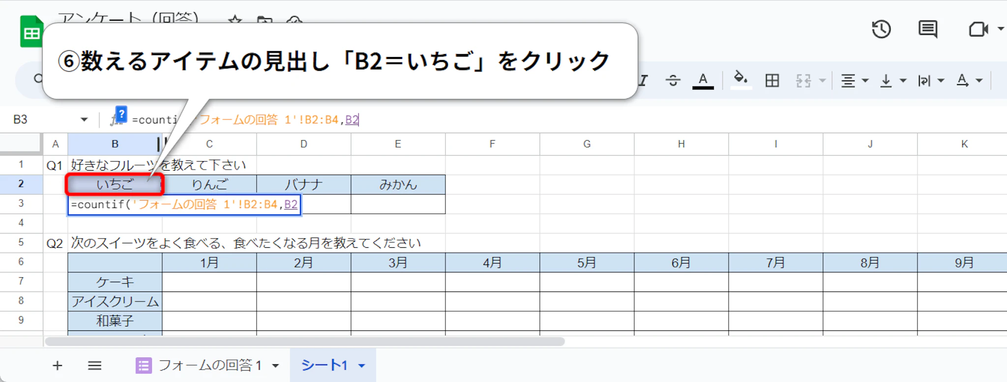 問1で「いちご」と回答した数をカウントする式を作成しましょう。