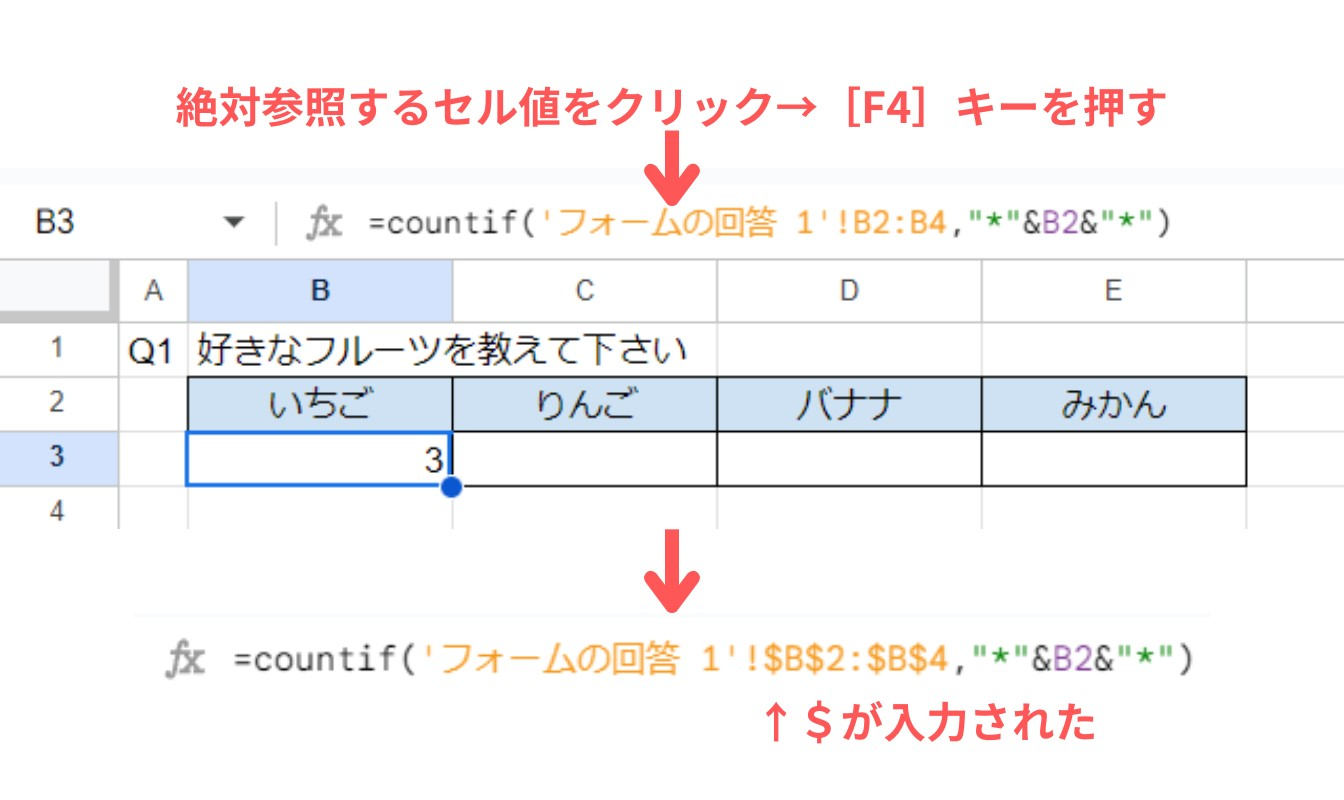 「りんご」や「バナナ」も同じようにカウントするために、式をコピーすると参照先がずれてしまい、カウントができません。
