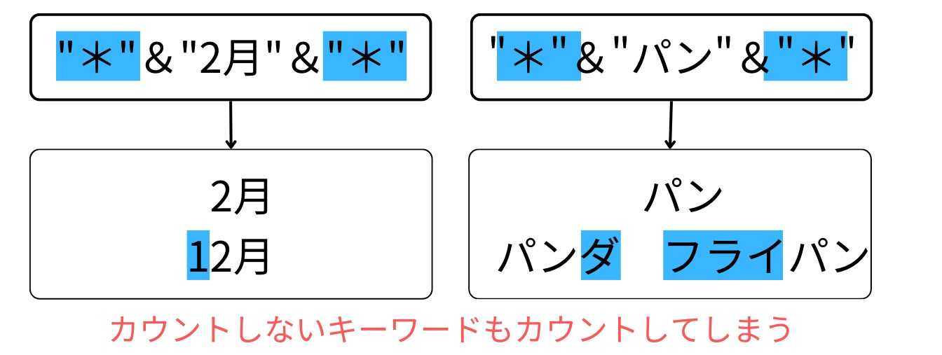 例えば、「2月」をカウントしたいのに、「12月」もカウントしてしまうという現象です。
