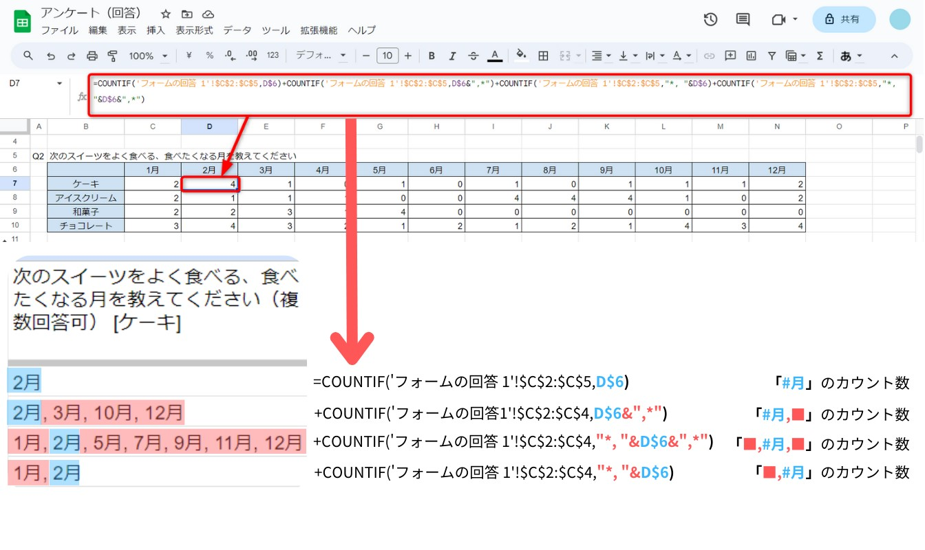 =COUNTIF('フォームの回答 1'!$C$2:$C$5,D$6)+COUNTIF('フォームの回答 1'!$C$2:$C$5,D$6&",*")+COUNTIF('フォームの回答 1'!$C$2:$C$5,"*, "&D$6)+COUNTIF('フォームの回答 1'!$C$2:$C$5,"*, "&D$6&",*")