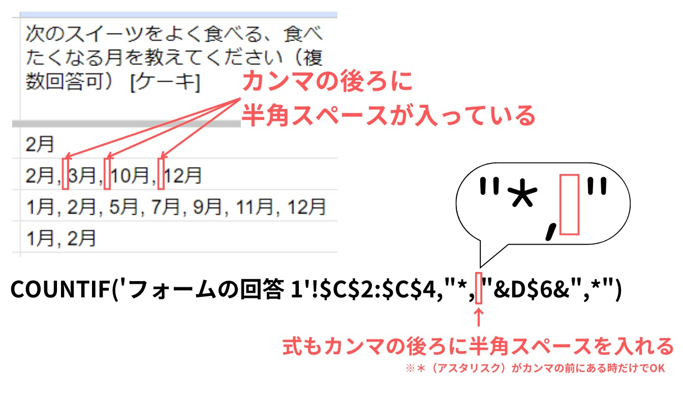 Googleフォームの集計データは、「,(カンマ)」と選択肢の間に「半角スペース」が入っています。式にも「半角スペース」を入れましょう。
