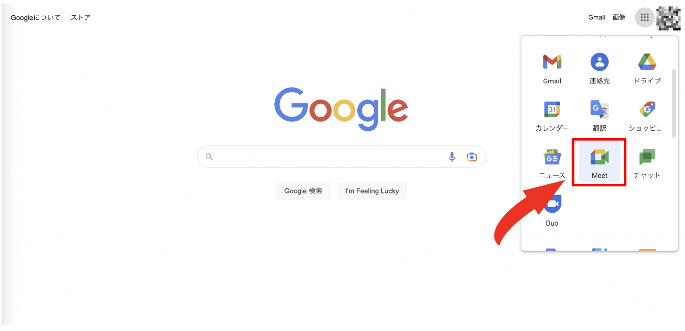 ホームページ画面の右上にあるボタンから画像のようなGoogle Meetのアイコンを選択しましょう。