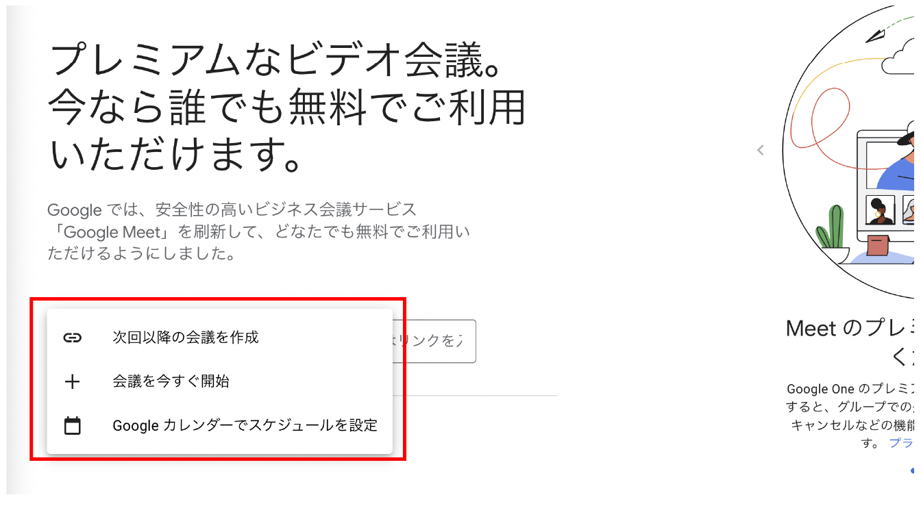 本サービスはもともとG Suiteとよばれるビジネス利用ユーザーだけの展開でしたが、テレワークの普及や、同サービスを無料で展開しているZoomに対抗するべく、Googleが一般ユーザー向けにも無料で開放したことでGoogleアカウントを持っているすべての人が利用できるツールになりました。