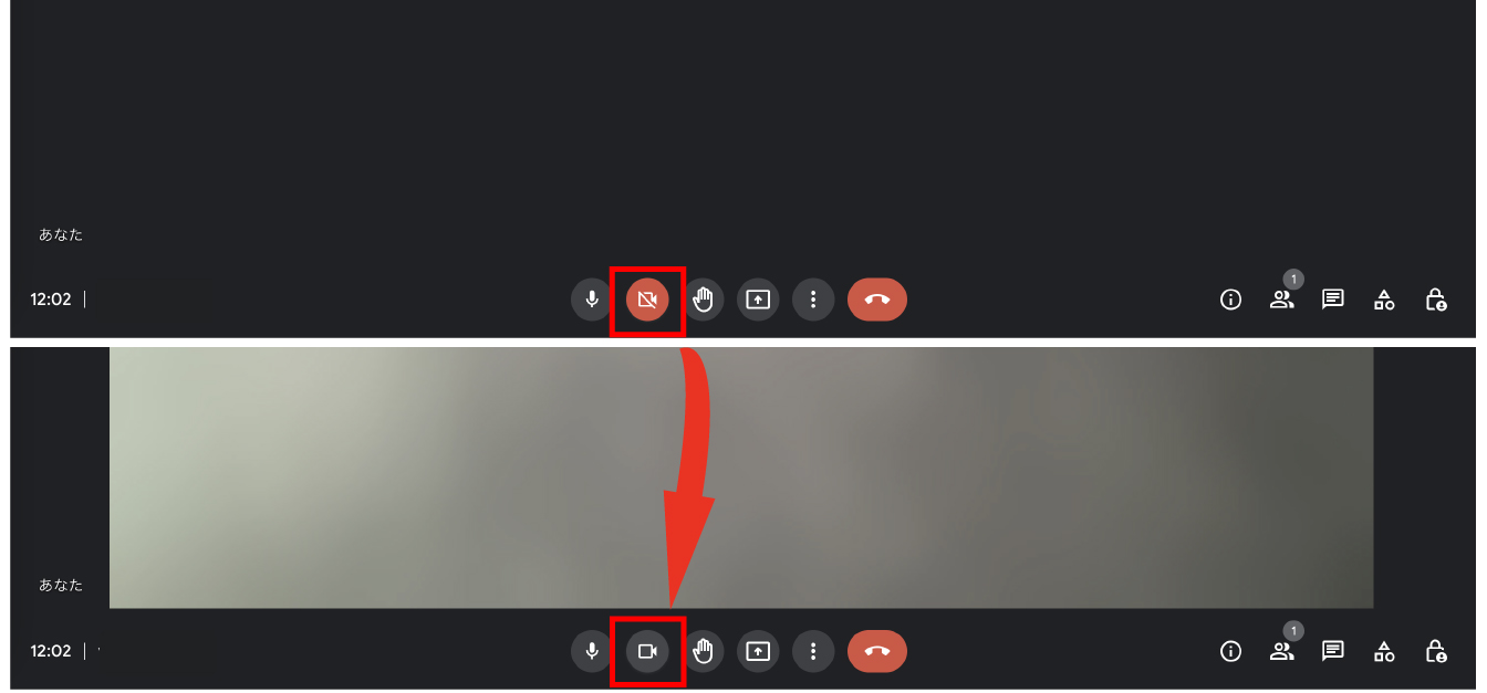 画面に映るカメラのON/OFF切り替えは赤色で囲まれた箇所でおこないます。