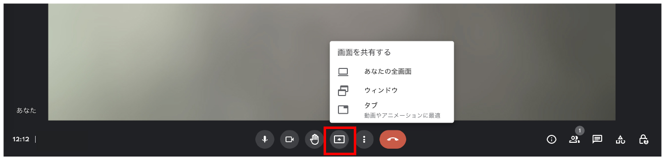 画面の共有はまず赤色で囲まれた箇所をクリックし、どのように画面を共有するかを選択します。