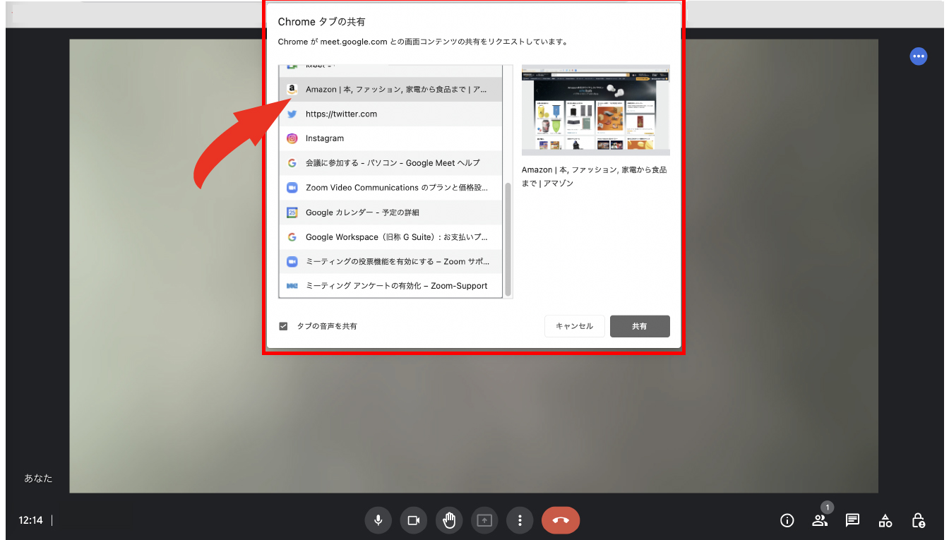 [タブ]についてはブラウザ内で開いているある1つのタブを共有したい場合にこちらを活用します。