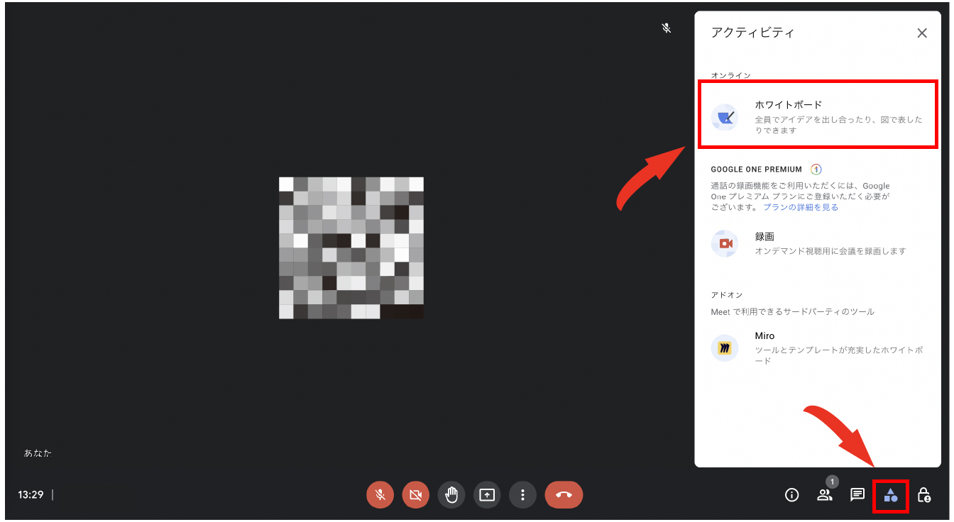 利用するときはまず、通話画面の右下にあるアクティビティのアイコンをクリックして、[ホワイトボード]を選択します。