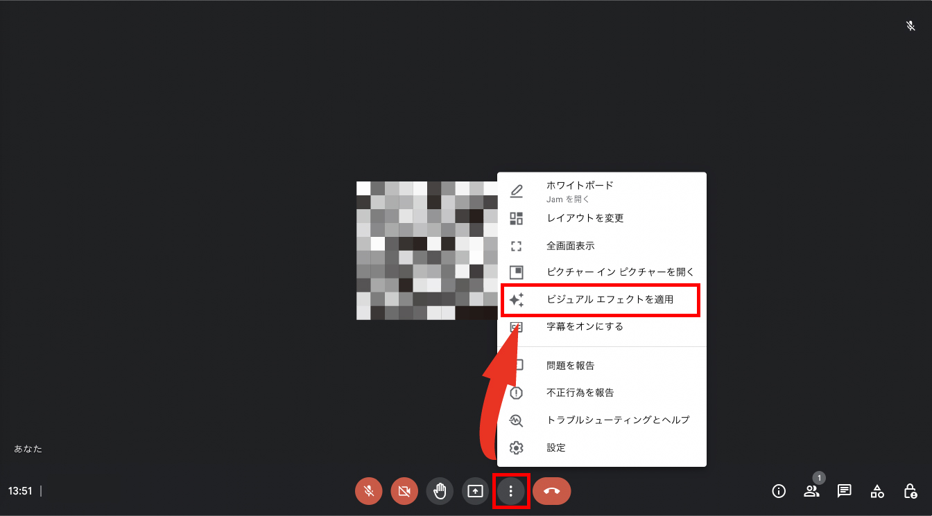 背景の変更はまず、赤枠で囲まれたアイコンをクリックし[ビジュアルエフェクトを適用]を選択します。