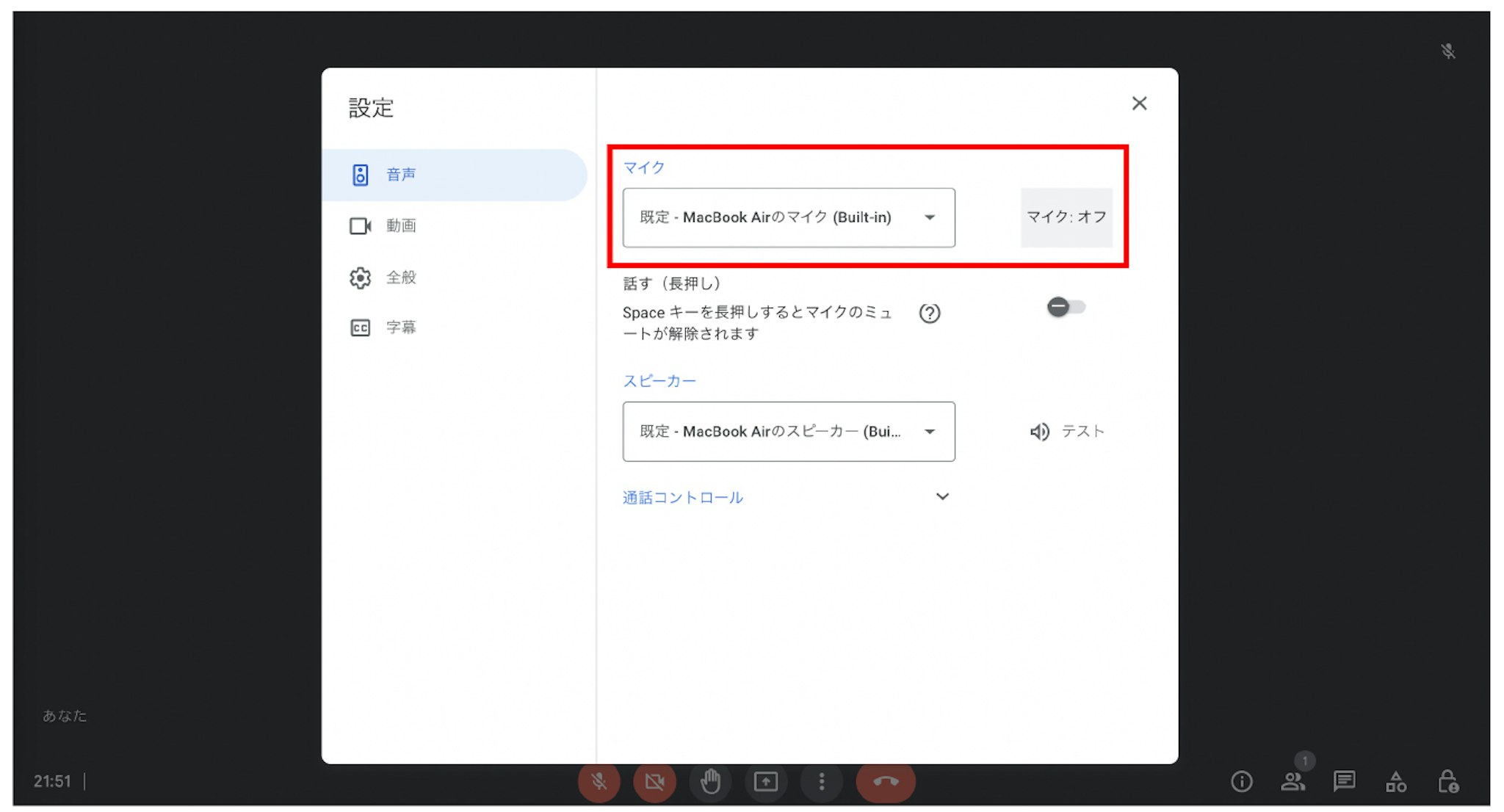 それでもマイクが使えない場合はGoogle Meetのマイク設定で適切なマイクが選択されているかを確認してみましょう。
