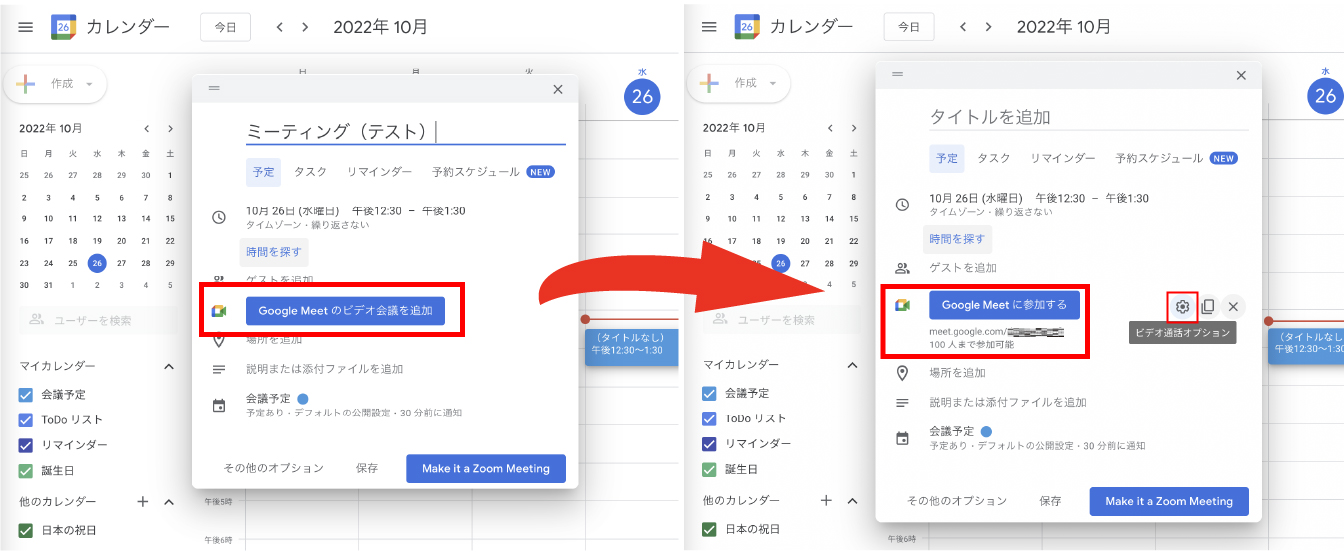 方法はGoogleカレンダー上で予定を作成し、予定の編集箇所に表示される「Google Meeのビデオ会議を追加」をクリックするのみです。すると自動でミーティングURLが生成されます。