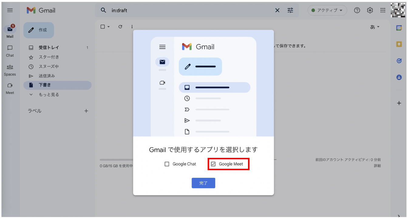 すると上のような画面になるので、[Google Meet]のチェックボックスを選択します。