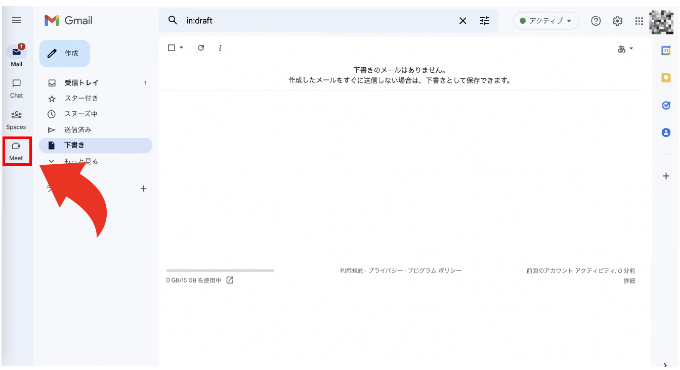 Gmailのホーム画面から直接Google Meetのミーティング作成、会議の参加ができます。