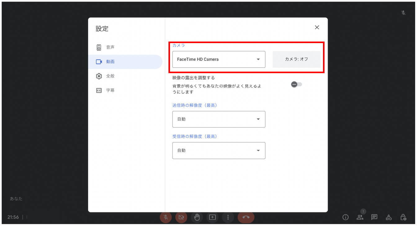原因がパソコンあるいはブラウザが原因ではない場合はGoogle Meetの設定で適切なカメラが選択されているかを確認してください。