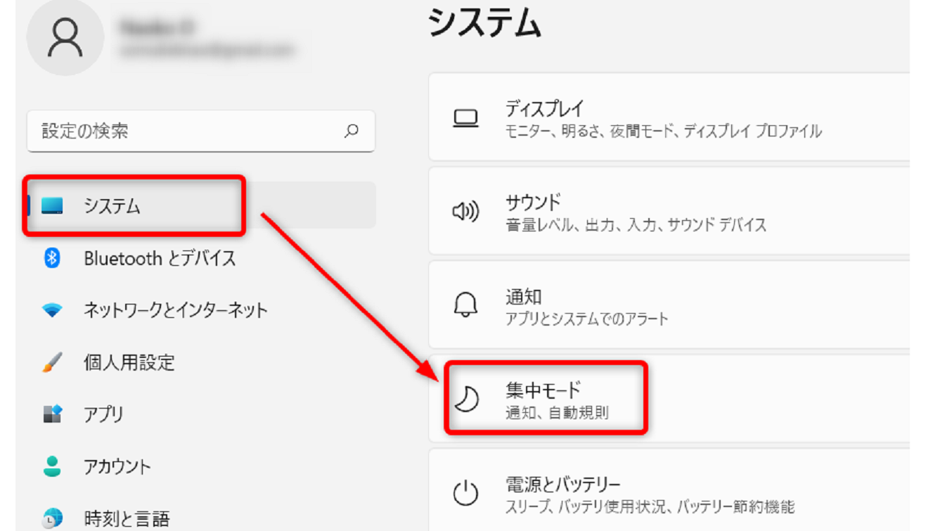 [システム]→[集中モード]を開きます