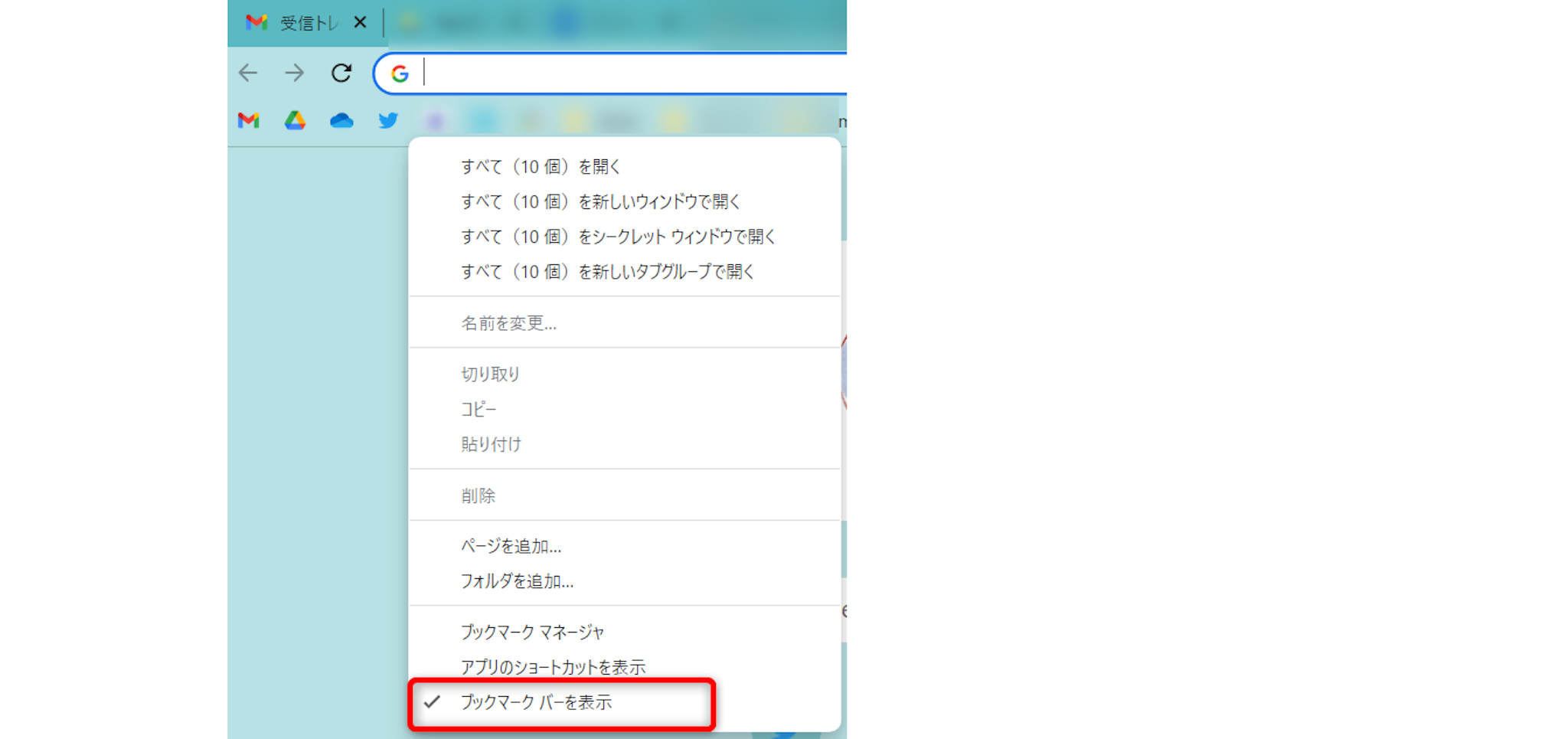 ブックマークバーを表示している場合は、ブックマークバーを非表示にしましょう。
