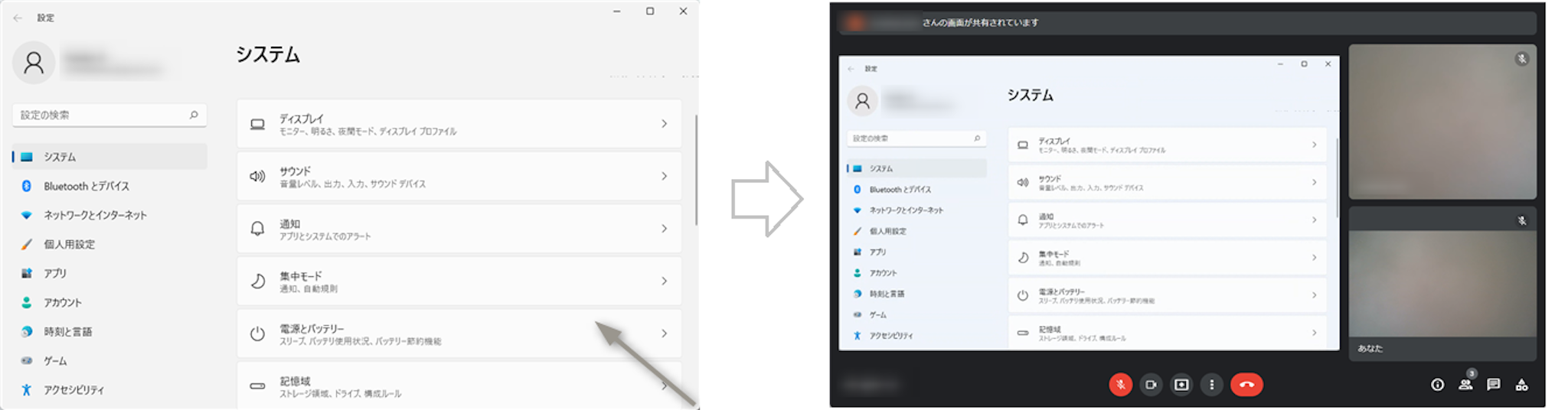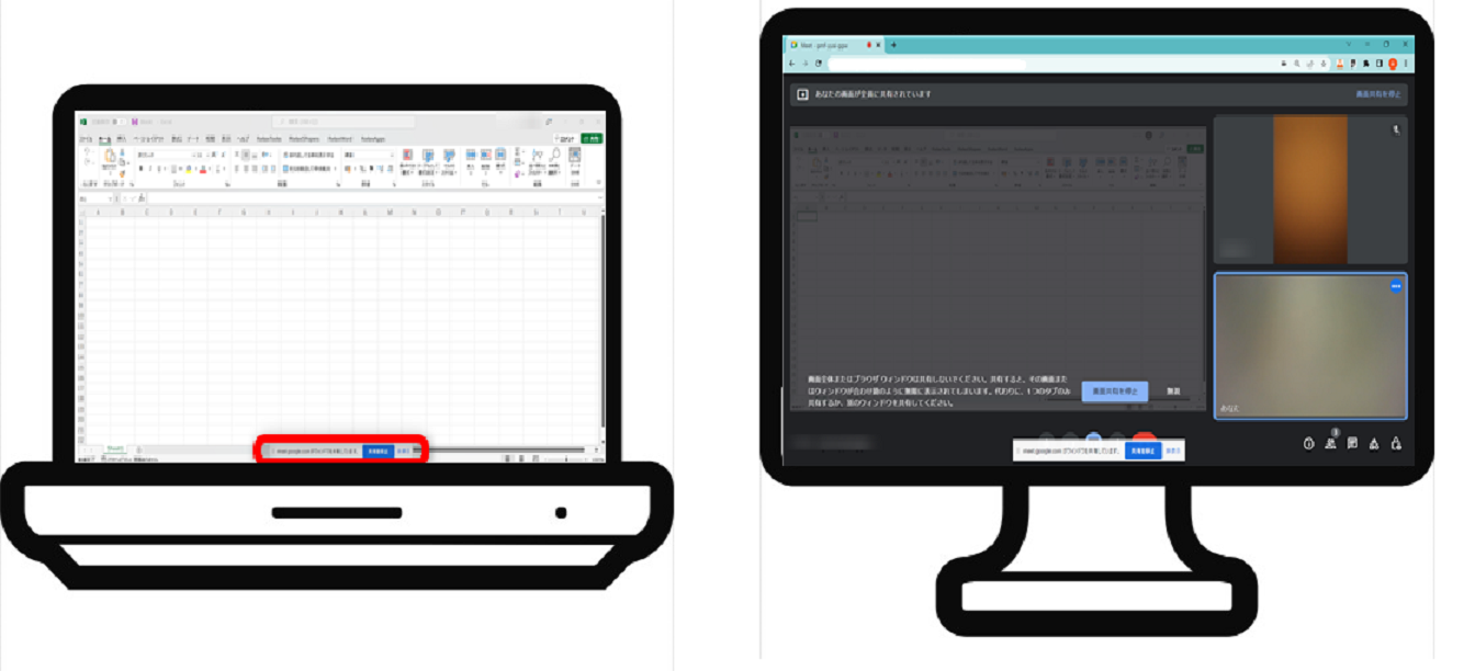 (左)共有する画面を小さくしたもの (右)共有された画面