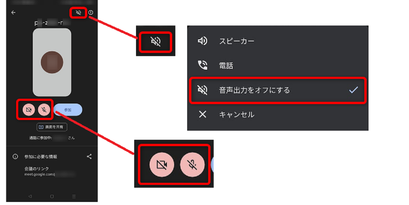 スピーカーをタップして[音声出力をオフにする]にチェック、
