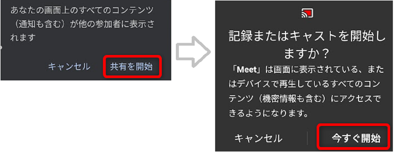 すべての画面が共有されますので、機密情報が見えないようにご注意ください。