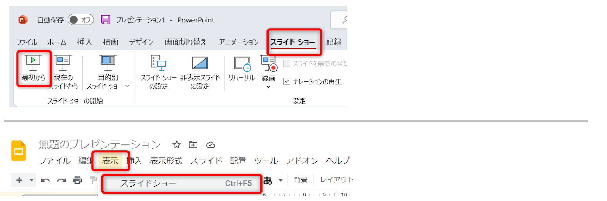 Googleスライド…[表示]→[スライドショー]をクリック