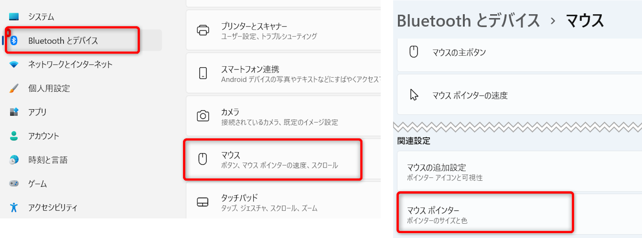 [設定]→[Bluetoothとデバイス]→[マウス]→[マウス ポインター]