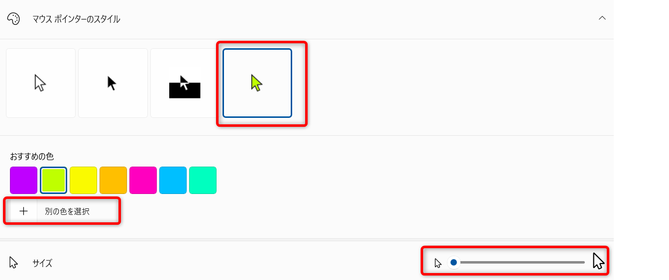 マウスポインタは設定で大きさや色を変えることができます。