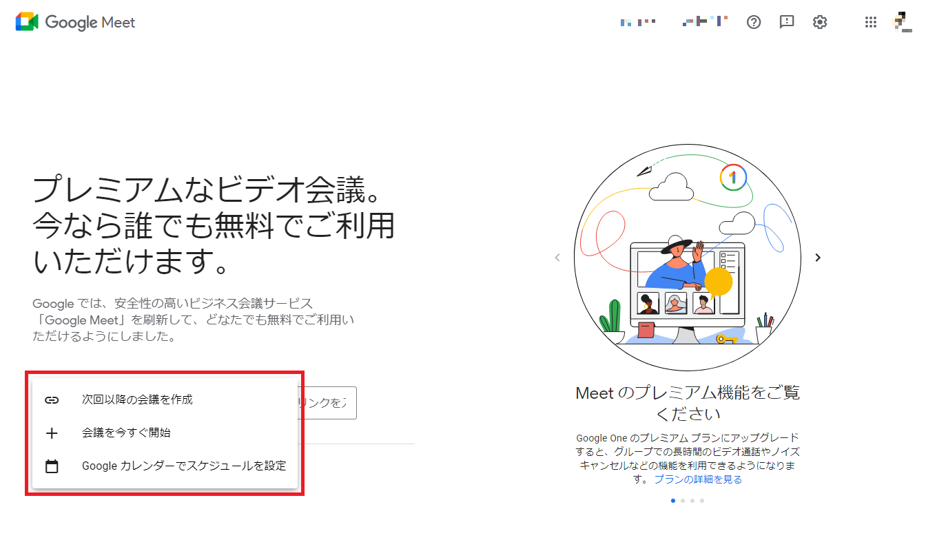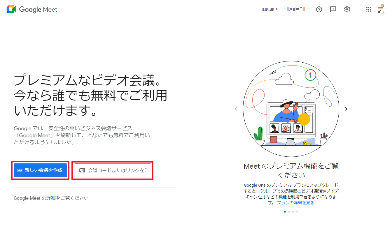まず最初にGoogleアカウントでアクセスしてGoogle Meetのホーム画面に移動します。