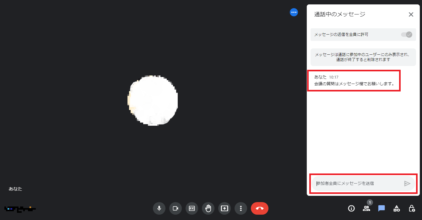 会議中の質問やマイクやカメラの故障時のメッセージなど参加者全員にメッセージを送ることができます。
