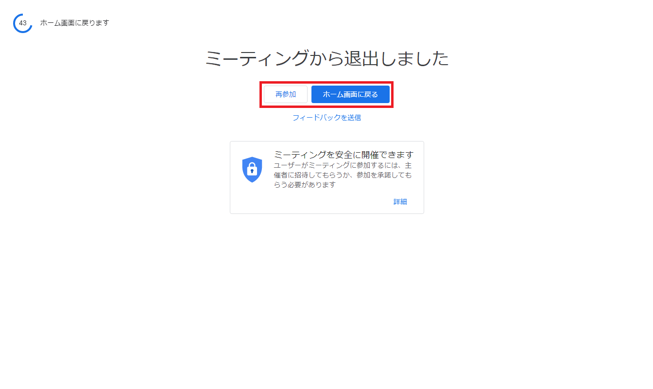 再び会議に参加する場合は「再参加」、終了する場合は「ホーム画面に戻る」を押します。
