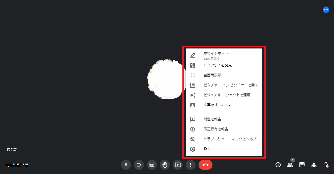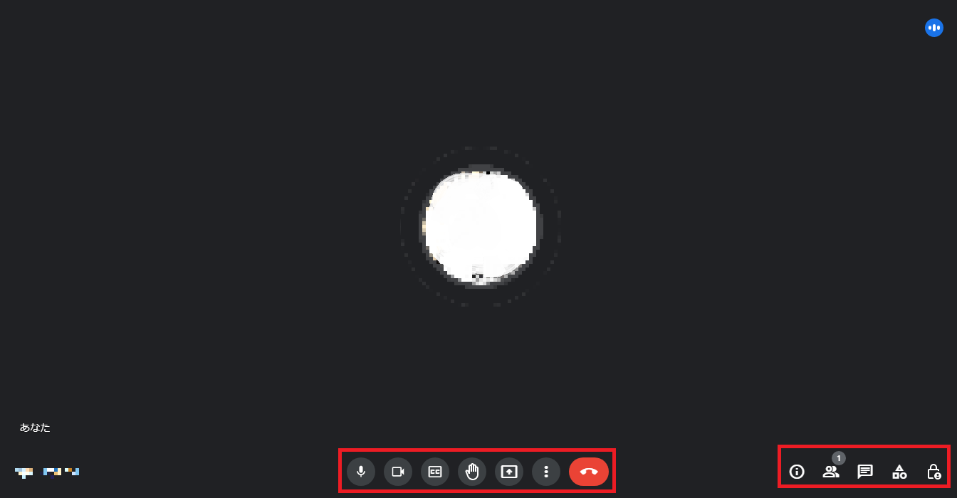 画面の中央に自分のアイコンが表示され、下に会議で利用するためのアイコン、右下に機能アイコンが並びます。