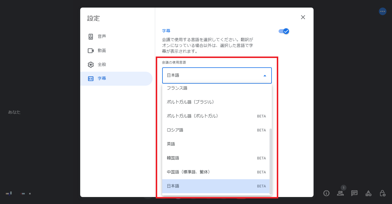 字幕アイコンを押して設定画面を表示、「会議の使用言語」から言語を選び設定すると