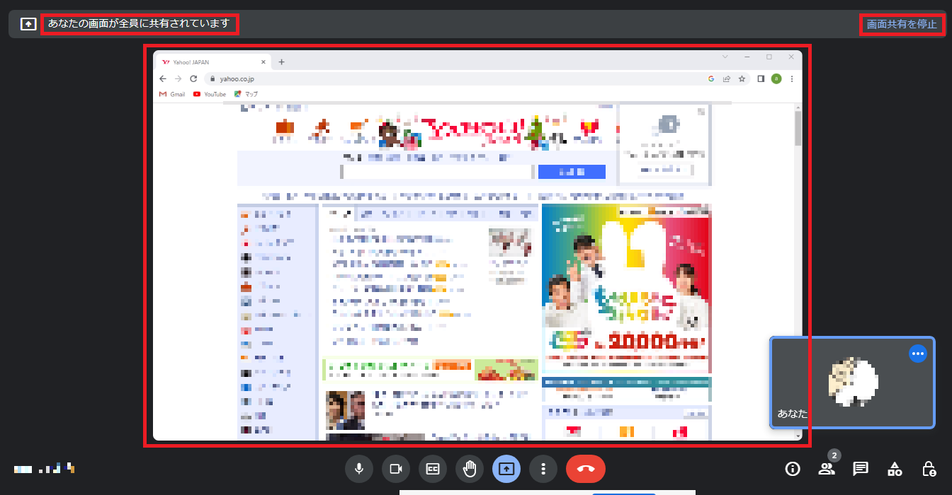 終了する場合は画面右上の「画面共有を停止」を押します。