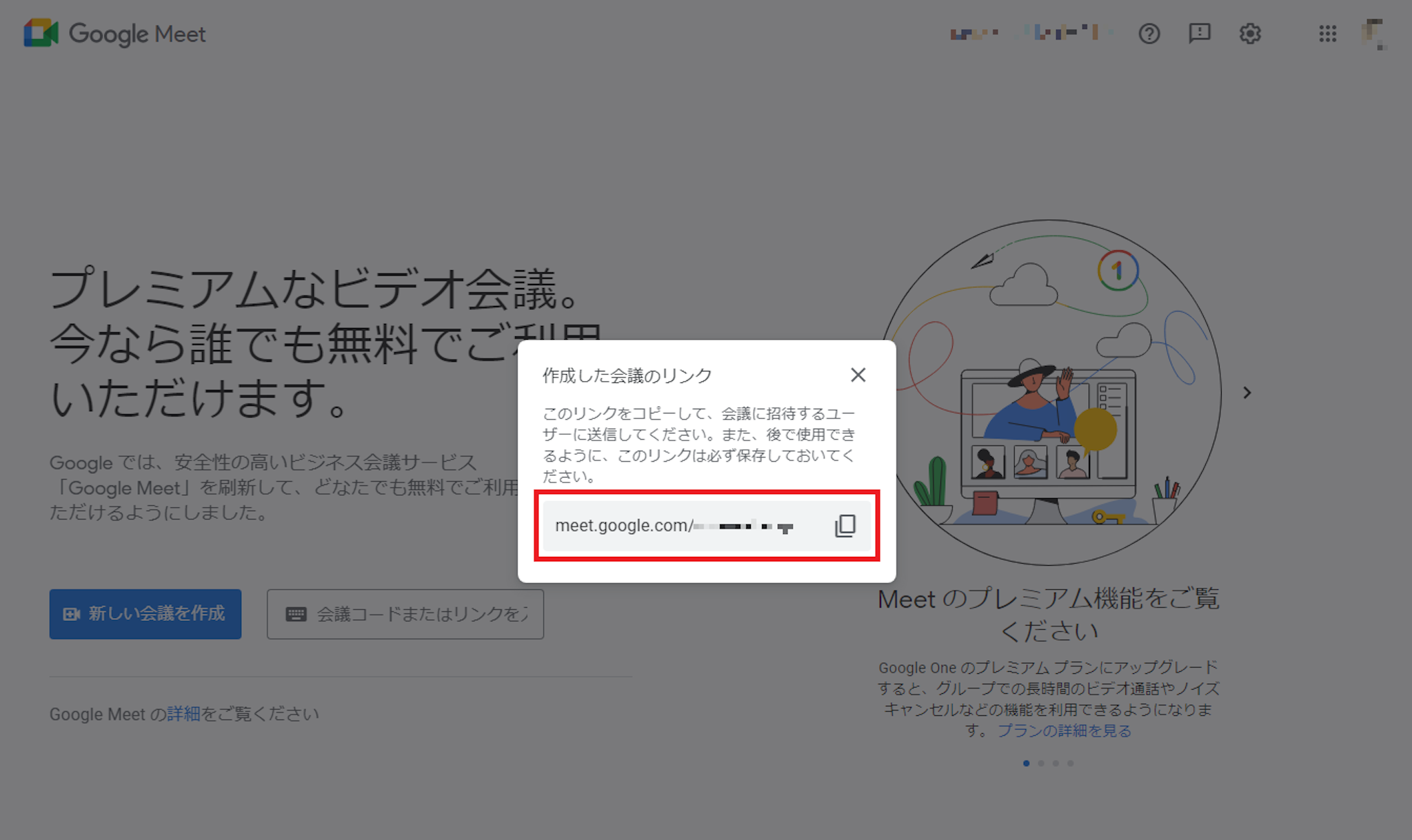 画面中央に「作成した会議リンク」が表示されます。