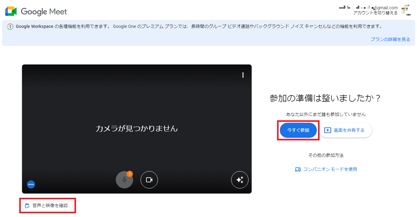 リンク先に移動すると待機画面が現れます。準備が整っているのなら「今すぐ参加」を押して会議に参加します。