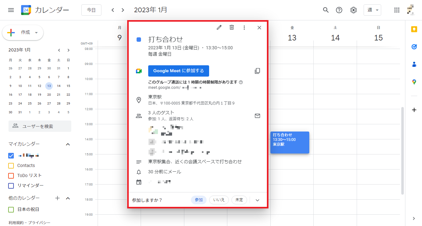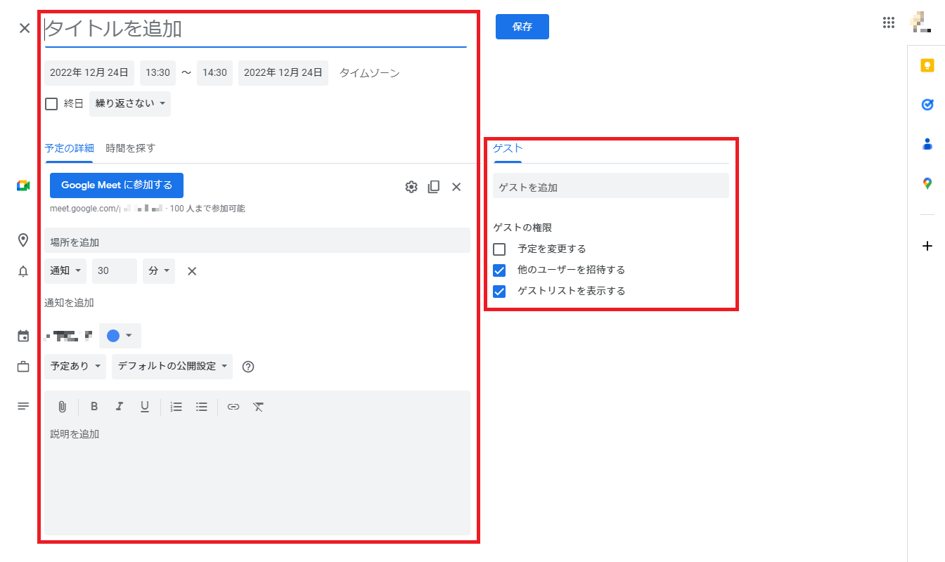 また会議の参加者がGoogleアカウントを持っていれば、Googleカレンダーで会議予定を共有することもできます。