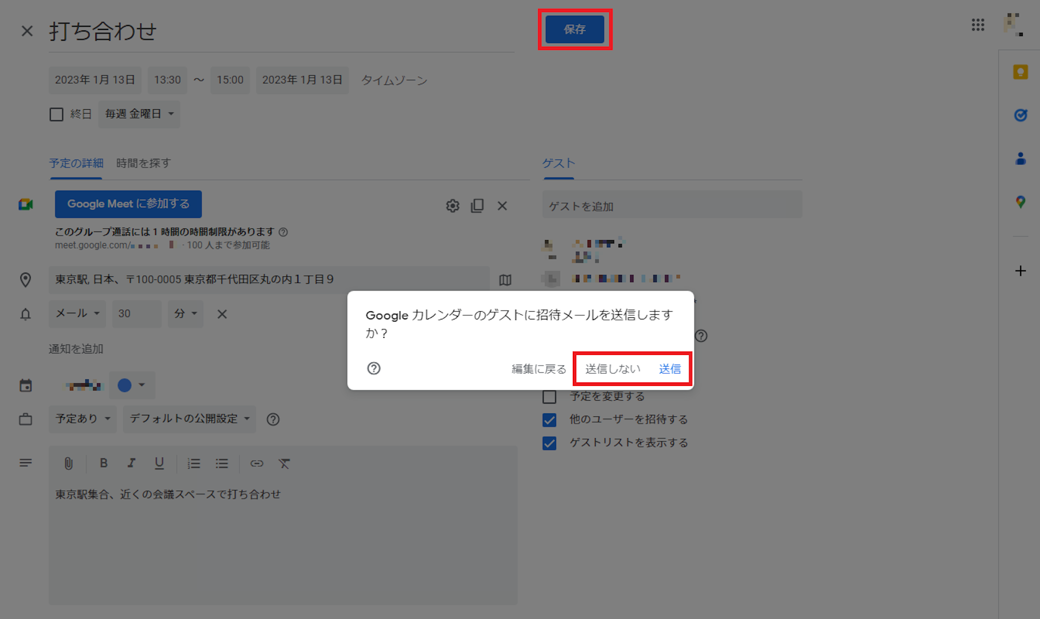 入力を完了して「保存」をゲストに招待メールの送信の可否を問われます。