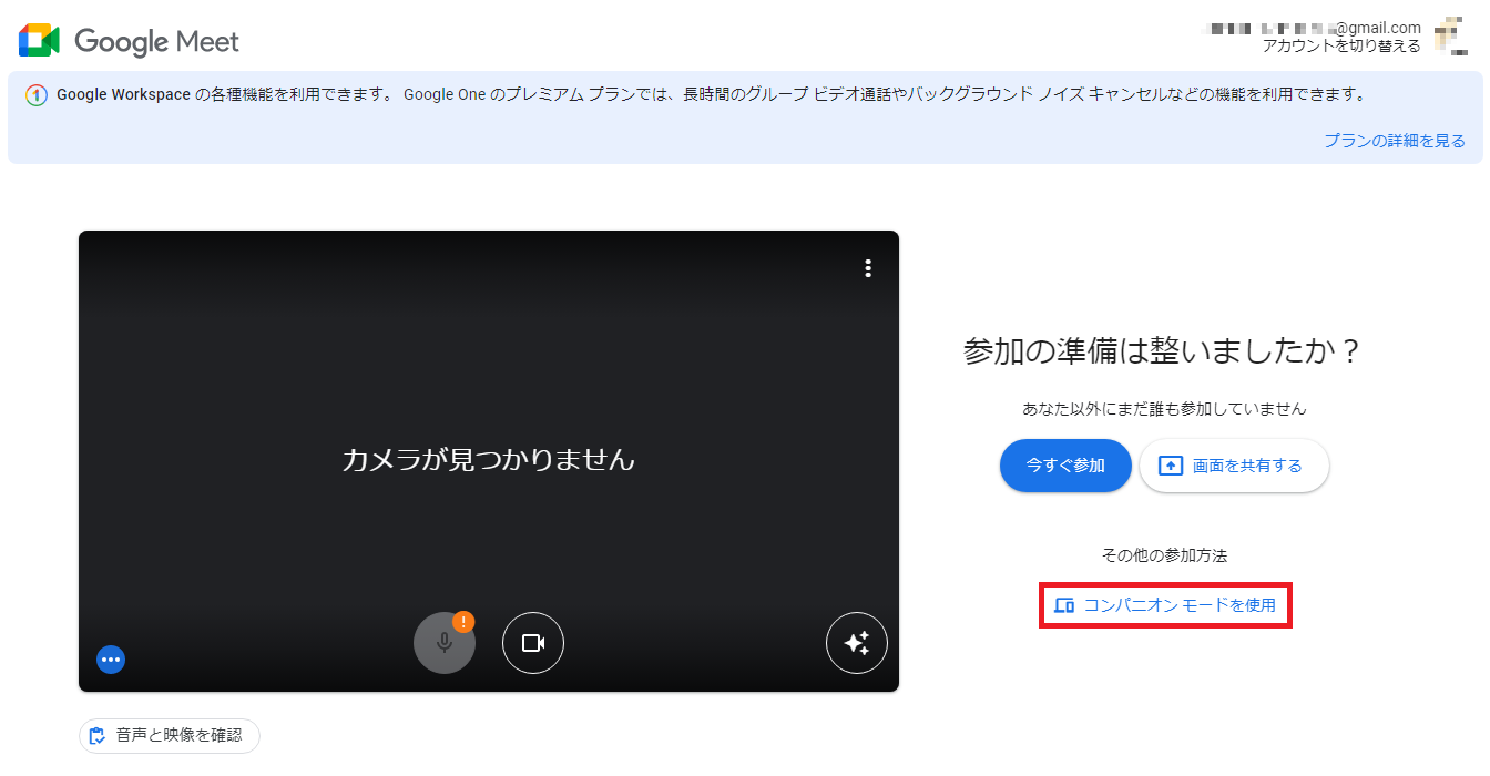 待機画面の右下「コンパニオンモードを使用」を押して会議に入ります。