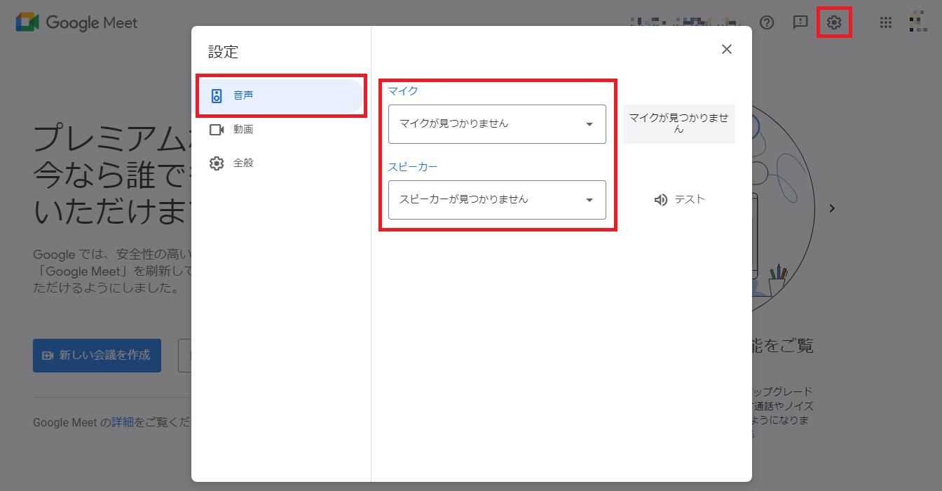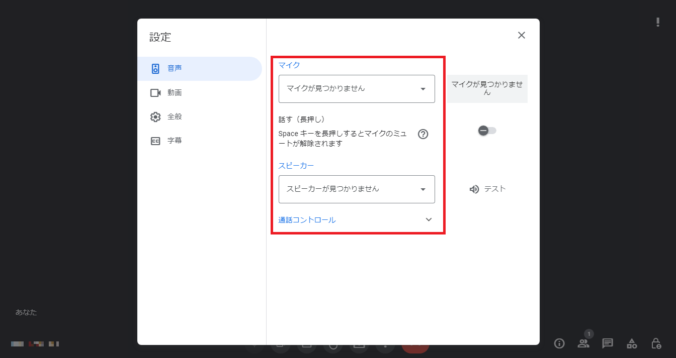 右上の設定アイコンから設定画面を表示させ、画面左のサイドメニューから「音声」を選択して「マイク」「スピーカー」が設定されているかを確認します。
