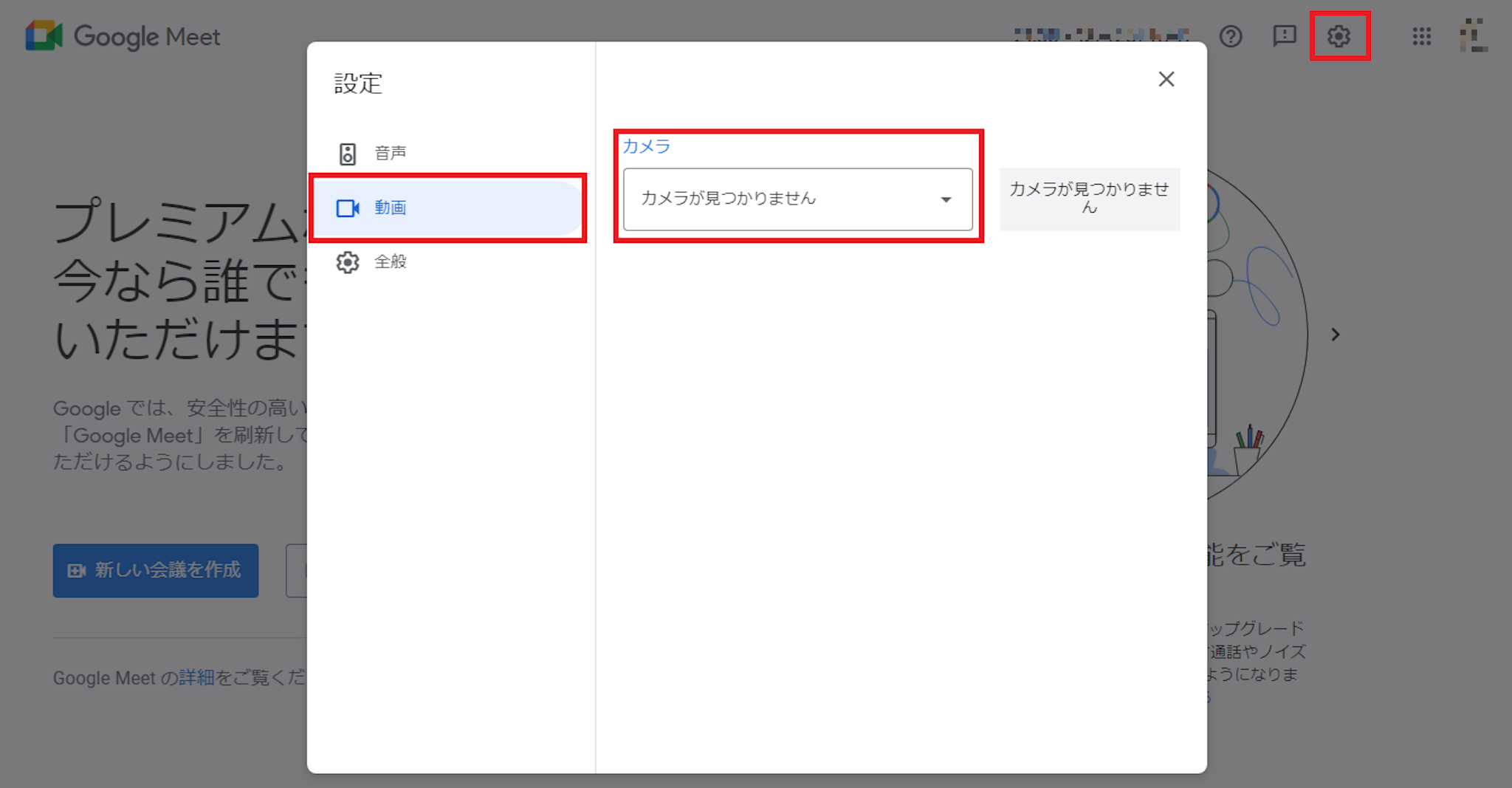 画面左の画面左のサイドメニューから「動画」を選択して「カメラ」が設定されているかを確認します。