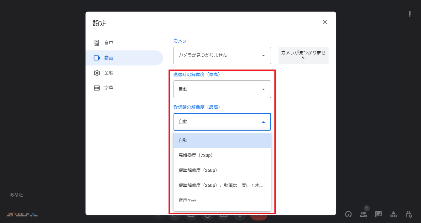 会議中の設定画面では「カメラ」以外に動画の解像度が変更可能です。