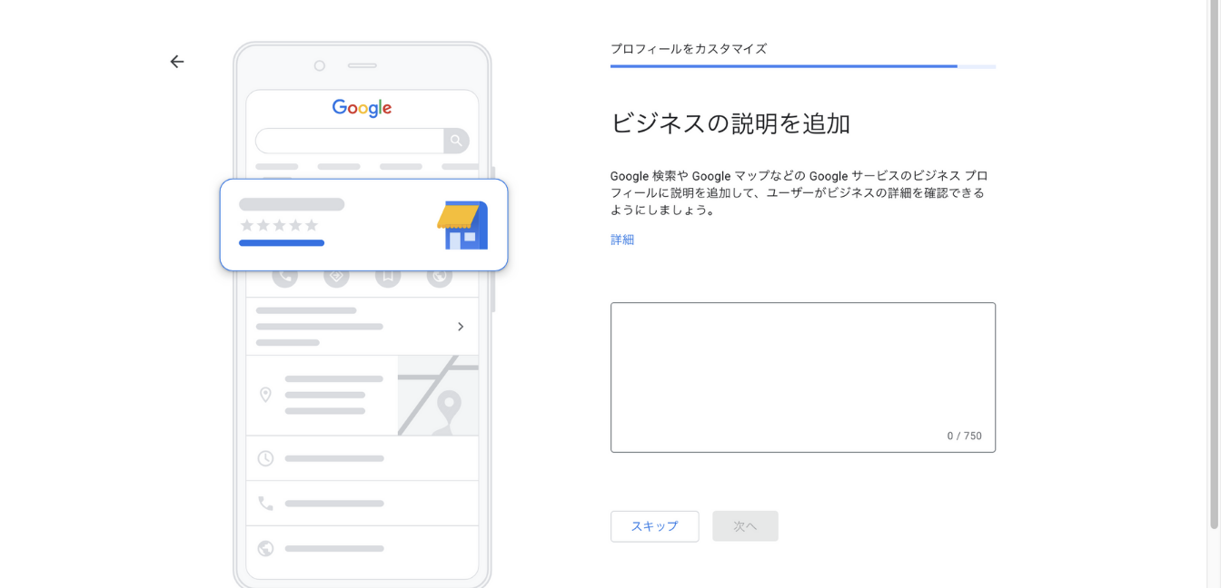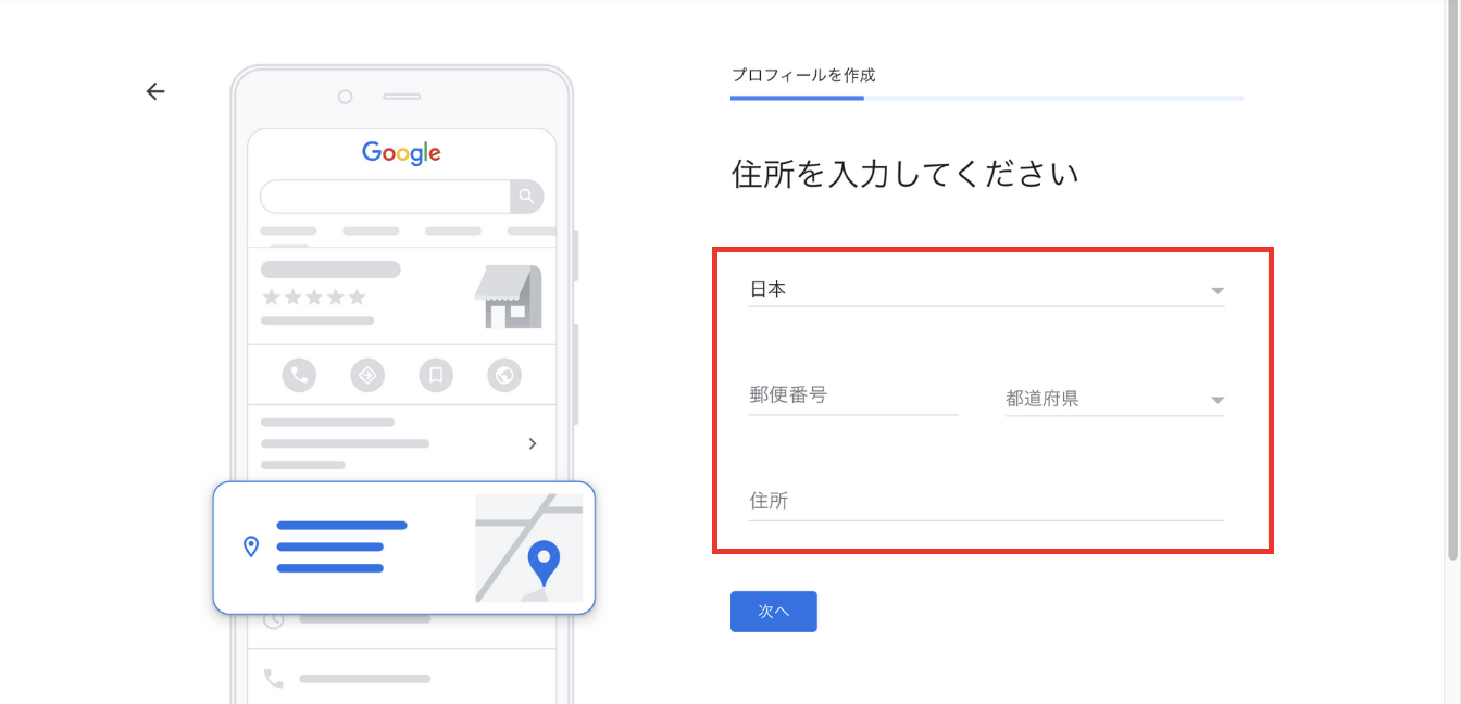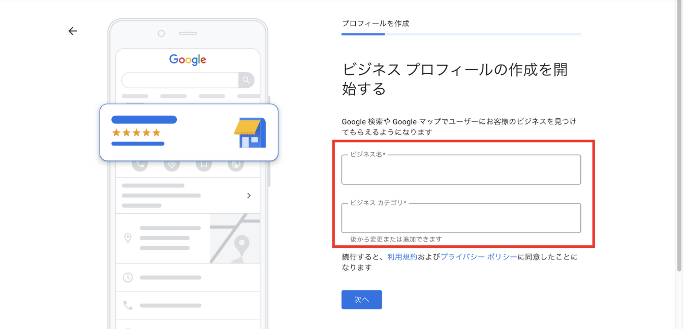 「ビジネス名」と「ビジネスカテゴリ」を入力し、「次へ」をクリックします。