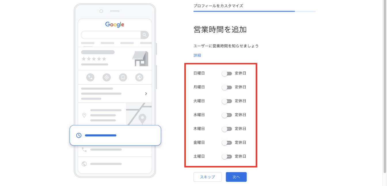 営業日が決まっている場合は、「営業日」と「時間」を設定します。