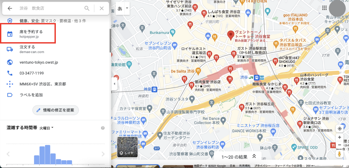 例えば、飲食店を検索したときに、Googleで予約が設定されていれば、下の画像のように、「席を予約」のボタンが表示されています。